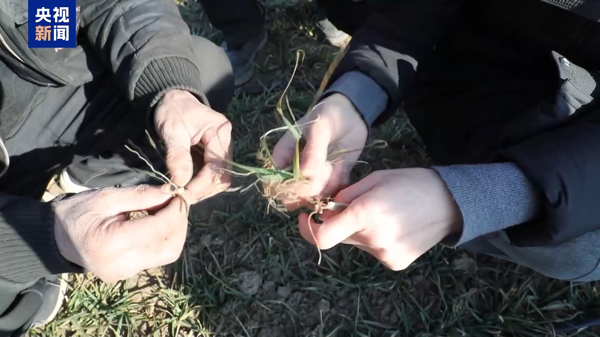 在山東煙臺(tái)招遠(yuǎn)市一處麥田里,農(nóng)技專家正仔細(xì)查看小麥的生長(zhǎng)情況。