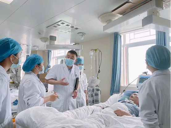 傅小云(左三)在病房了解病人情況。(受訪者供圖)