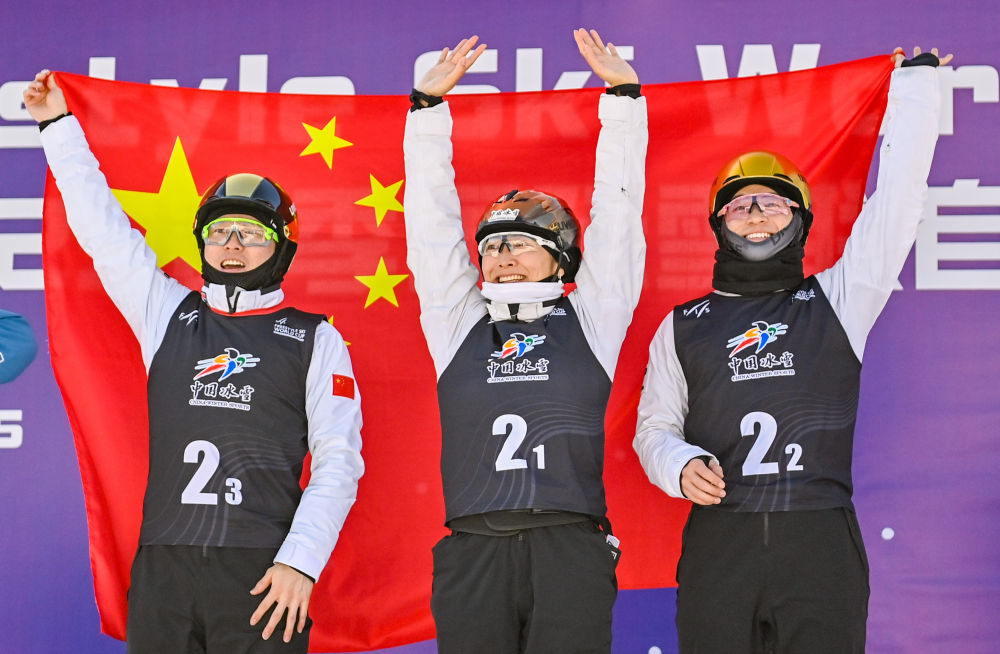 2月24日,在2024-2025賽季國際雪聯(lián)自由式滑雪世界杯(北大湖站)空中技巧混合團(tuán)體決賽中,由徐夢桃、李天馬、齊廣璞組成的中國一隊獲得金牌。圖為中國一隊徐夢桃(中)、李天馬(右)、齊廣璞在頒獎儀式上。新華社記者 顏麟蘊(yùn) 攝
