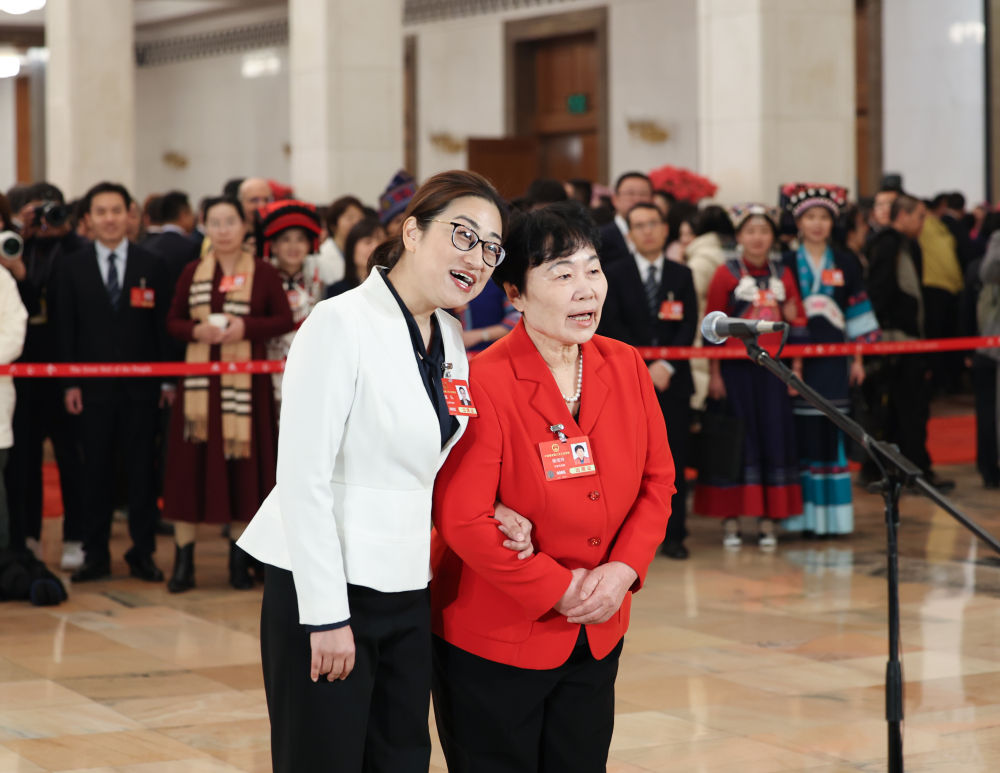 3月8日,第十四屆全國人民代表大會第三次會議第二場“代表通道”集中采訪活動在北京人民大會堂舉行。這是全國人大代表盛弘(左)和楊寶玲向廣大婦女致以節(jié)日祝福。新華社記者 呂帥 攝