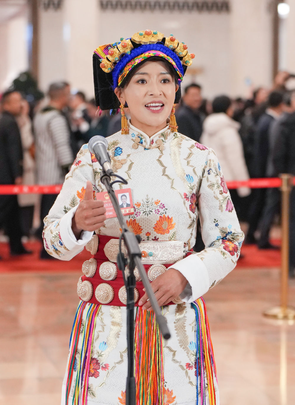 3月5日,第十四屆全國人民代表大會第三次會議首場“代表通道”集中采訪活動在北京人民大會堂舉行。這是全國人大代表格西王姆接受媒體采訪。新華社記者 劉大偉 攝