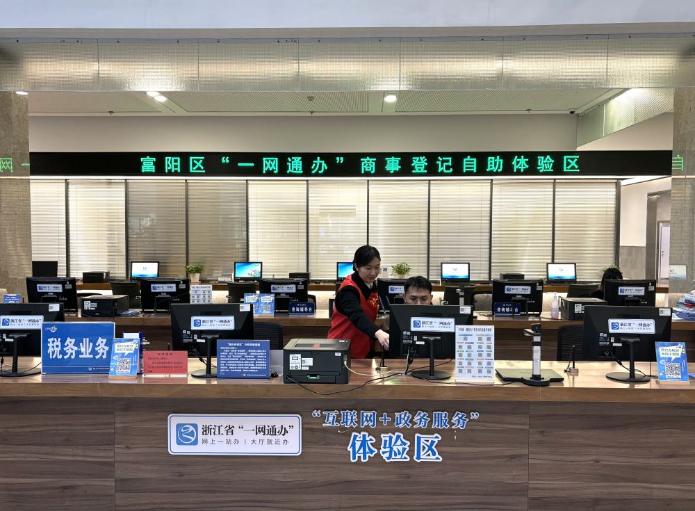 2月18日,在杭州市富陽(yáng)區(qū)政務(wù)服務(wù)中心,工作人員引導(dǎo)群眾自助辦理“一網(wǎng)通辦”事項(xiàng)。(受訪(fǎng)單位供圖)