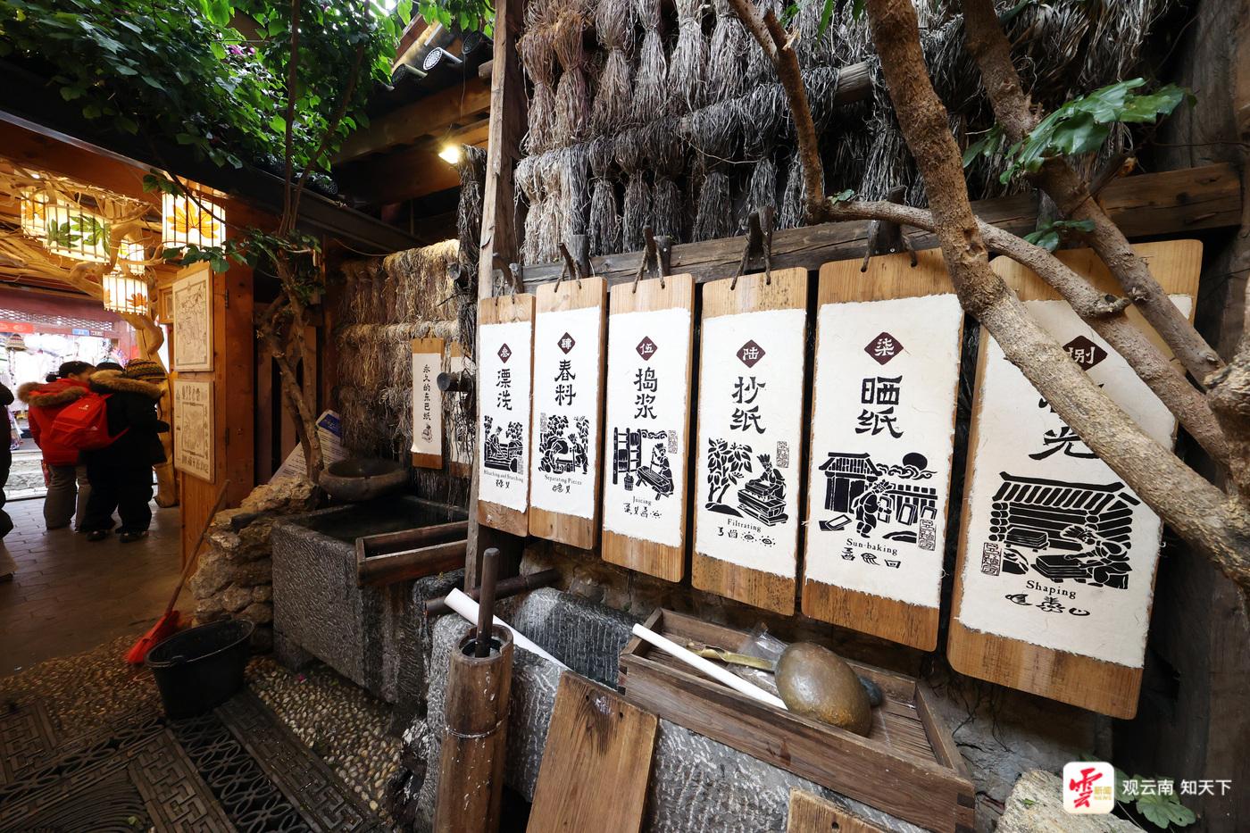 麗江古城內(nèi)以東巴文化體驗(yàn)為亮點(diǎn)的“東巴紙坊”吸引著許多中外游客。在這里,游客們可以體驗(yàn)到搗漿、抄紙、曬紙等東巴紙制作工藝,還能拿起東巴象形文字印章集章打卡。如果你好奇某個(gè)象形文字的含義,還能在這里買到一本東巴文“字典”,一一對(duì)照查看?!跋啾韧辏衲甓嗔瞬簧賮碜孕录悠?、馬來西亞的游客,東巴紙燈、明信片都是很受他們喜愛的產(chǎn)品?!睎|巴紙坊麗江銷售人員韓雨辰說。
