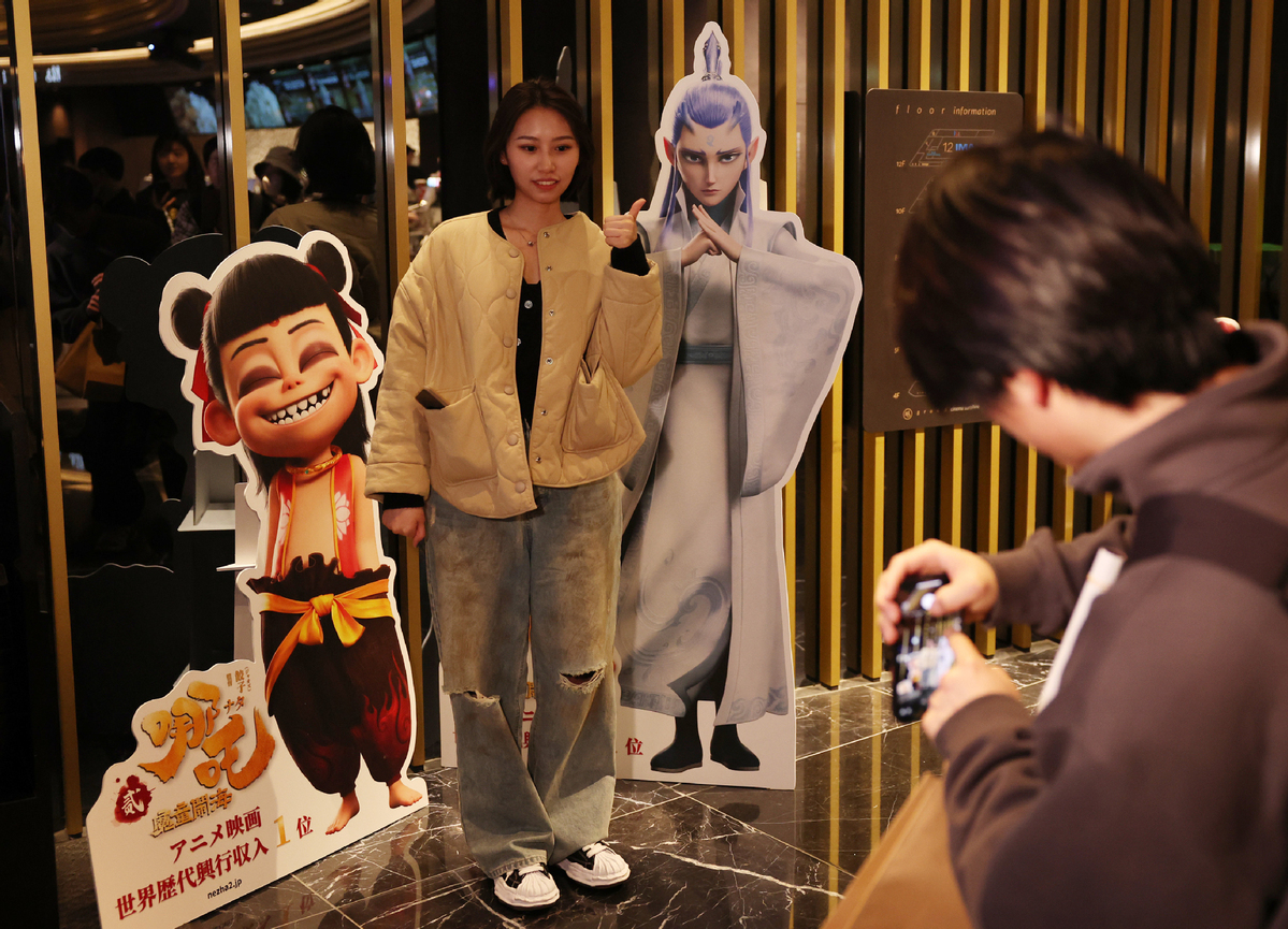 3月14日,在日本東京,一名觀眾在《哪吒之魔童鬧海》日本首映式后與電影宣傳板合影。(圖片來源:新華社)