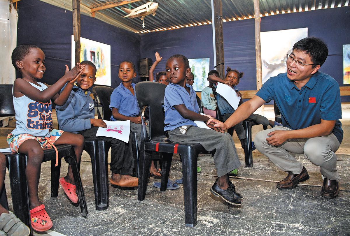 在納米比亞溫得和克的弗朗斯·南賓加藝術(shù)培訓中心,一名中國醫(yī)療隊隊員向孩子們講解正確的洗手方法。(圖片/新華社)