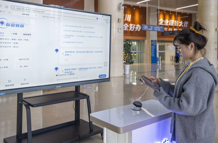 3月21日,辦事人員在銀川市審批服務(wù)管理局企業(yè)服務(wù)大廳使用智能客服查詢(xún)信息。新華社記者 楊植森 攝