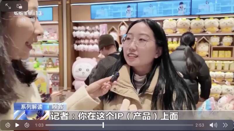 北京朝陽(yáng)區(qū)的一家IP聯(lián)名店,可以看到首發(fā)、首秀的國(guó)產(chǎn)周邊衍生品。截圖來(lái)自央視新聞