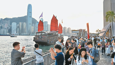 旅客在香港尖沙咀星光大道一帶游玩?! ≈行律缬浾?李志華攝