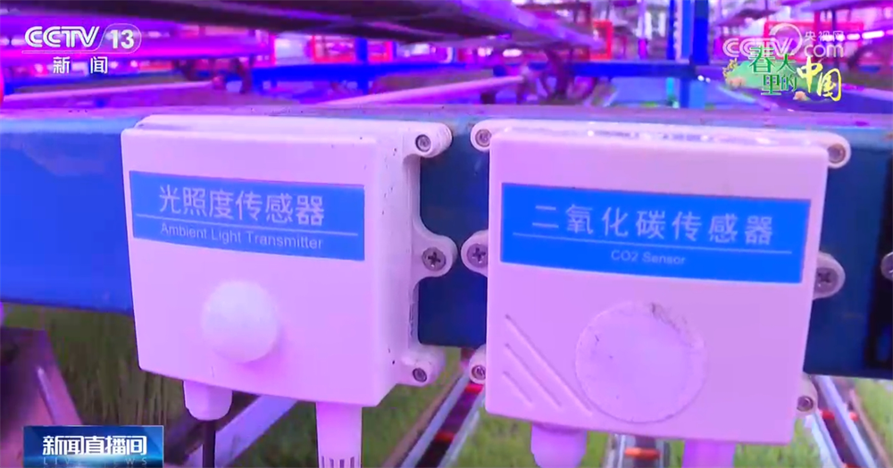 來到這個育秧車間,我們可以看到現(xiàn)在的秧苗都已經(jīng)坐上電梯了。在立體循環(huán)育秧架上,一盤盤綠油油的秧苗坐著升降梯輪流接受光照。架子上還裝有智能傳感器,把溫度、濕度等信息實時顯示在大屏上。同時,還可以用手機進行遠程操控,根據(jù)秧苗長勢自動進行補光、噴淋。