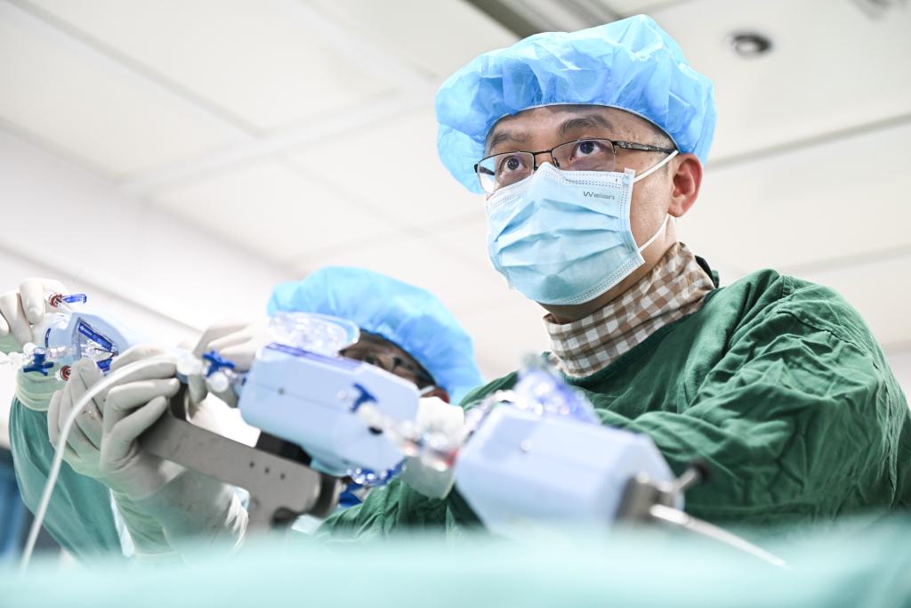 2月20日,在南京市第一醫(yī)院,張俊杰和團隊在心導管室為患者進行經(jīng)導管二尖瓣緣對緣修復手術(shù)。(新華社記者 季春鵬 攝)