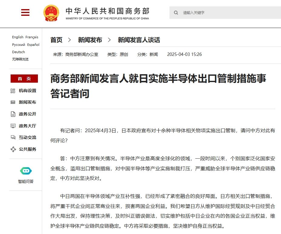 有記者問:2025年4月3日,日本政府宣布對十余種半導(dǎo)體相關(guān)物項實施出口管制,請問中方對此有何評論?