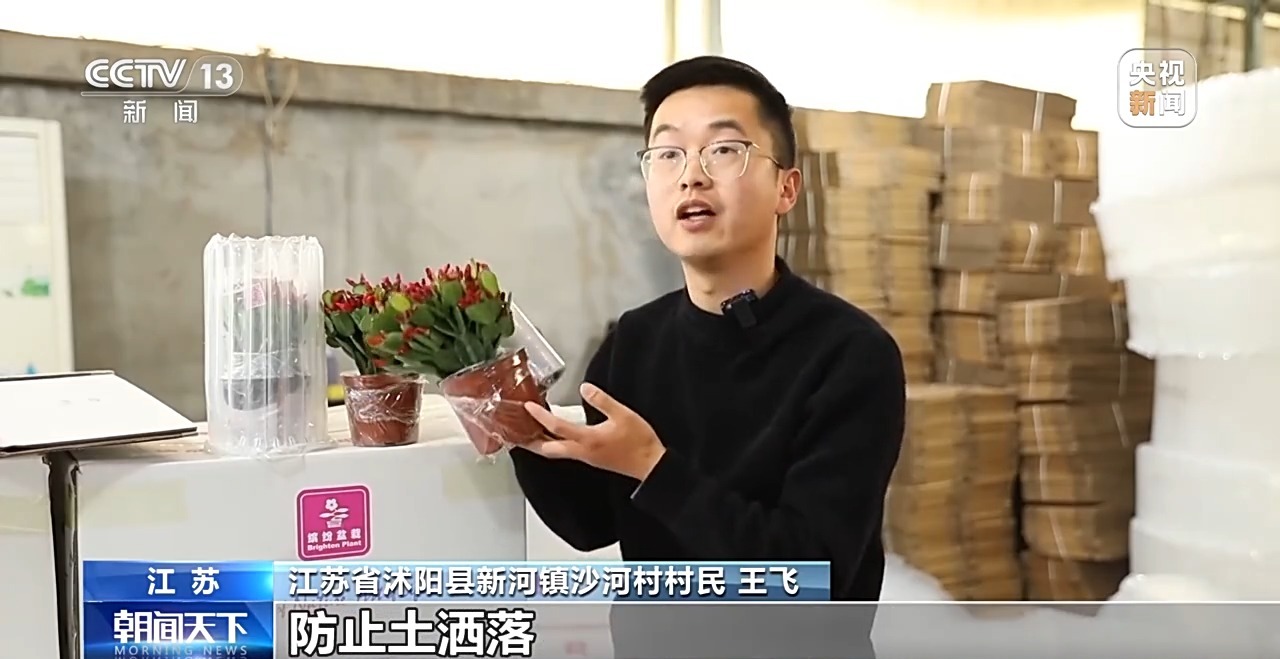 江蘇省沭陽(yáng)縣新河鎮(zhèn)沙河村村民 王飛:我們先用保鮮膜鎖住盆里面的水分,防止土灑落,這樣的包裝可以讓花到買(mǎi)家手里時(shí)更新鮮一點(diǎn)。然后會(huì)用到防摔的氣柱,能保護(hù)花朵。