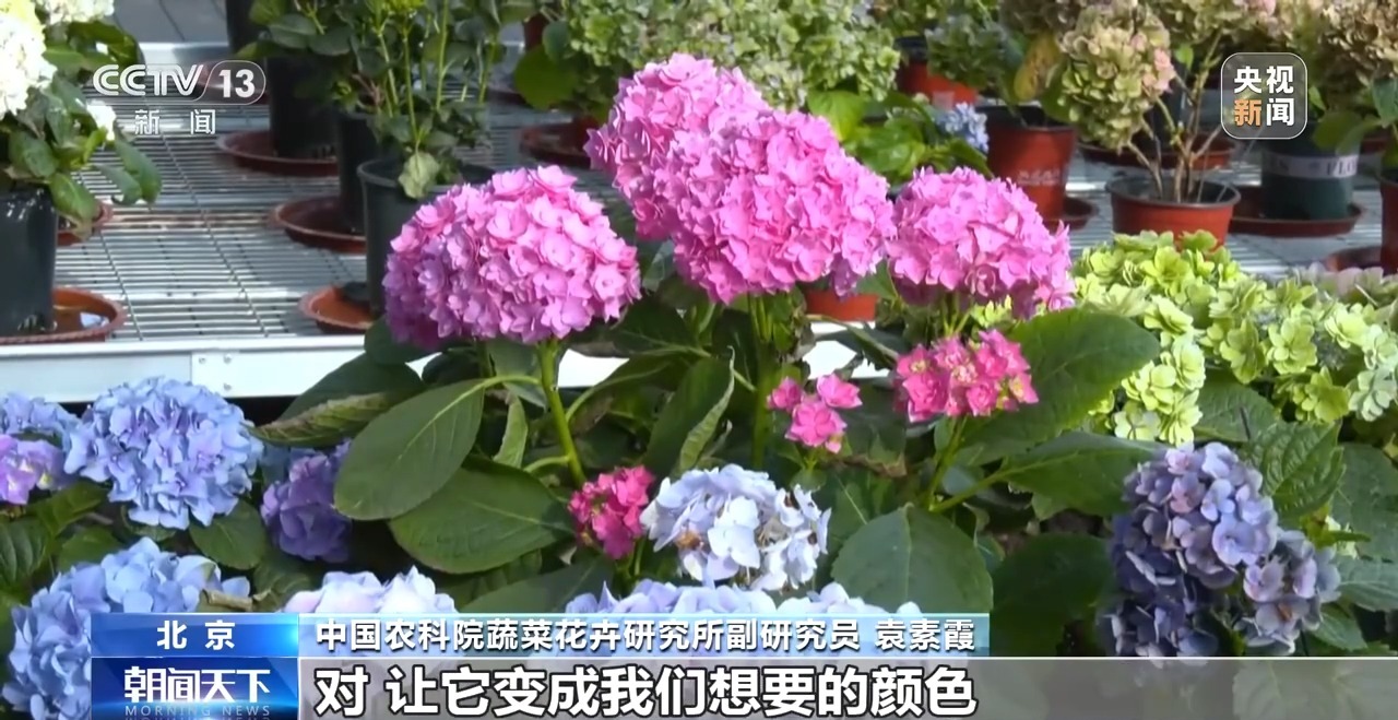 繡球被稱(chēng)為植物中的變色龍,在中國(guó)農(nóng)科院的實(shí)驗(yàn)大棚里,粉色的花朵經(jīng)過(guò)科研人員的調(diào)控后,就會(huì)變成藍(lán)色稀有色,深受消費(fèi)者的喜愛(ài)。