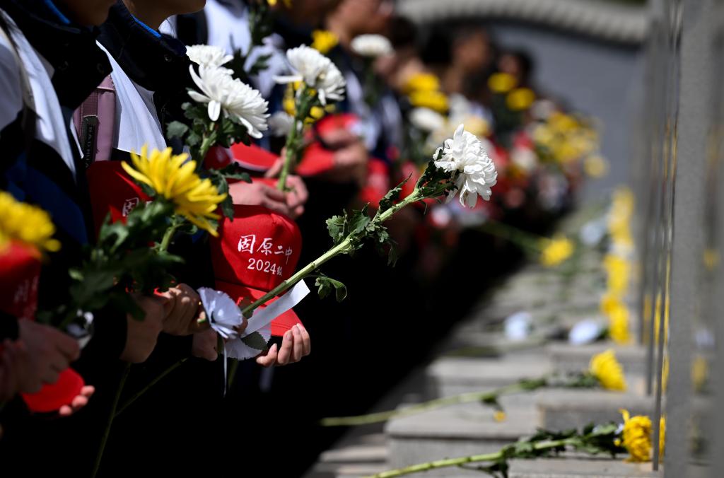 4月3日,抵達任山河烈士陵園的學(xué)生們手持白菊原地休整。
