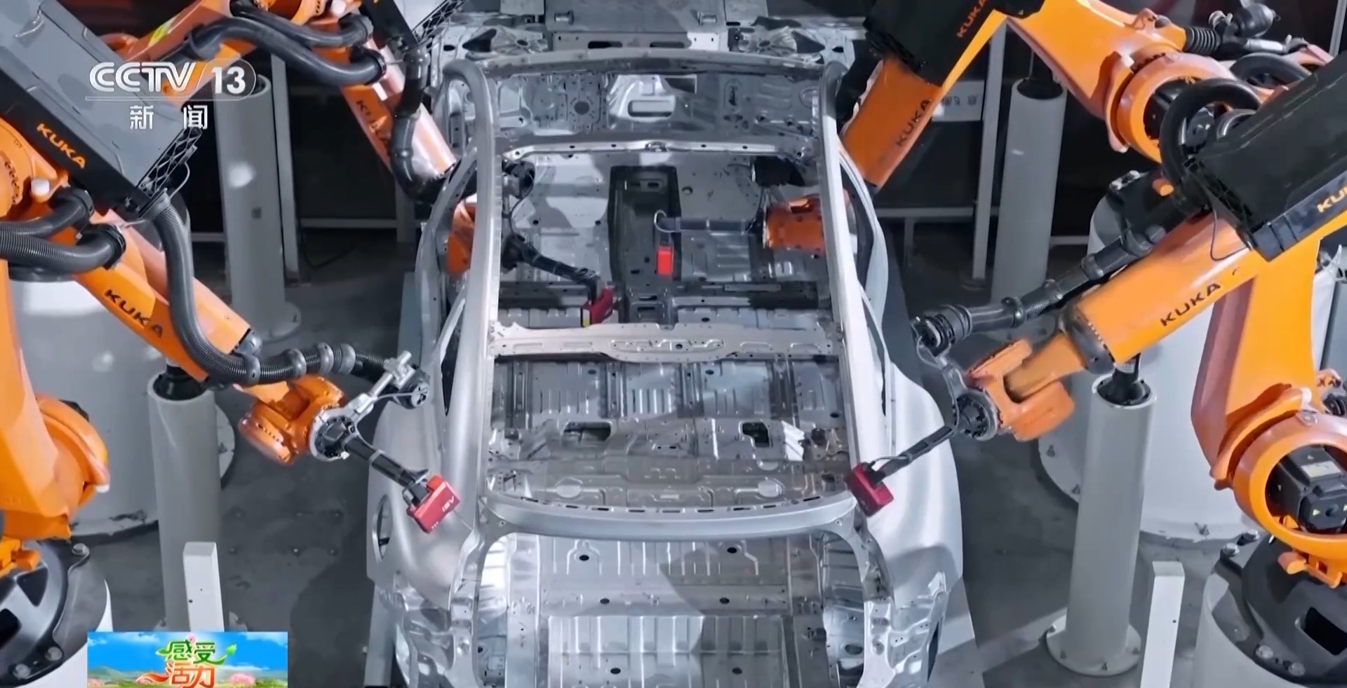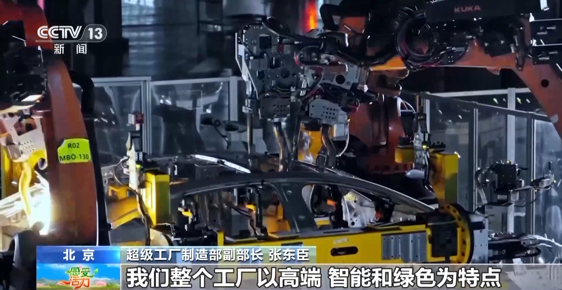 超級(jí)工廠制造部副部長(zhǎng) 張東臣:我們整個(gè)沖壓是通過(guò)6700噸的沖壓機(jī),每個(gè)零件從生產(chǎn)到完成是3.75秒,也就是說(shuō)一分鐘可以生產(chǎn)16個(gè)部件。焊裝的主線全自動(dòng)化率100%,現(xiàn)在是兩分鐘下線一臺(tái)車身。這條生產(chǎn)線有527個(gè)機(jī)器人在同步作業(yè),搬運(yùn)、涂膠、焊接、鉚接、檢測(cè),機(jī)械手臂無(wú)處不在。