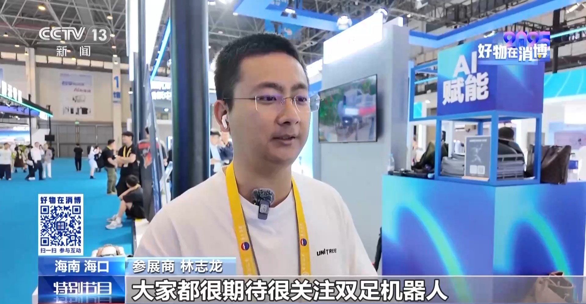 參展商 林志龍:大家都很期待很關(guān)注雙足機(jī)器人,這次來(lái)消博會(huì),也是想更加廣泛聽(tīng)取消費(fèi)者對(duì)于產(chǎn)品的包括場(chǎng)景需求應(yīng)用的呼聲,然后可以針對(duì)性地再去做之后的產(chǎn)品的設(shè)計(jì)和規(guī)劃。