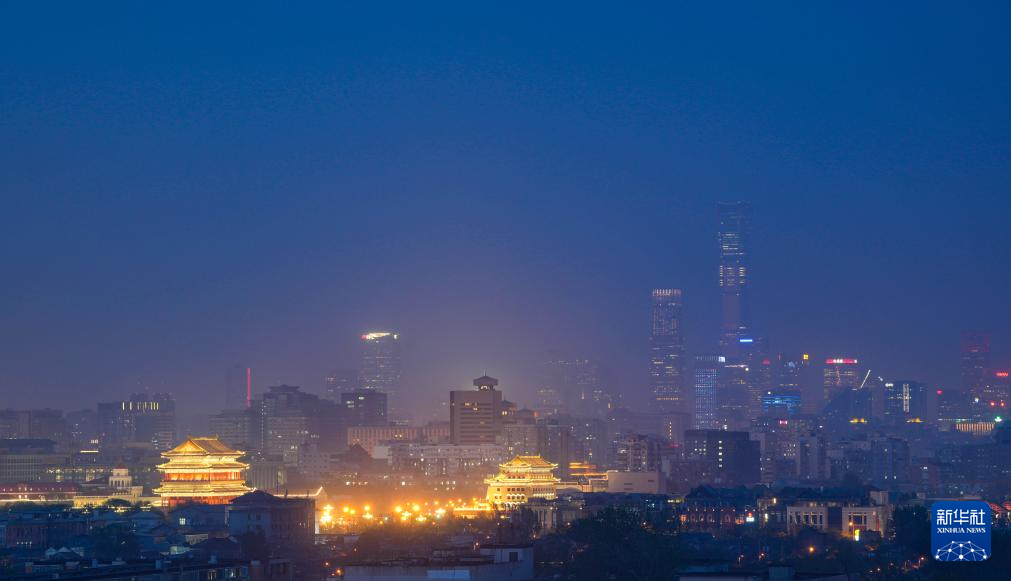 北京日落后的正陽門城樓、箭樓和遠處的CBD建筑群(4月14日攝)。新華社記者 陳曄華 攝