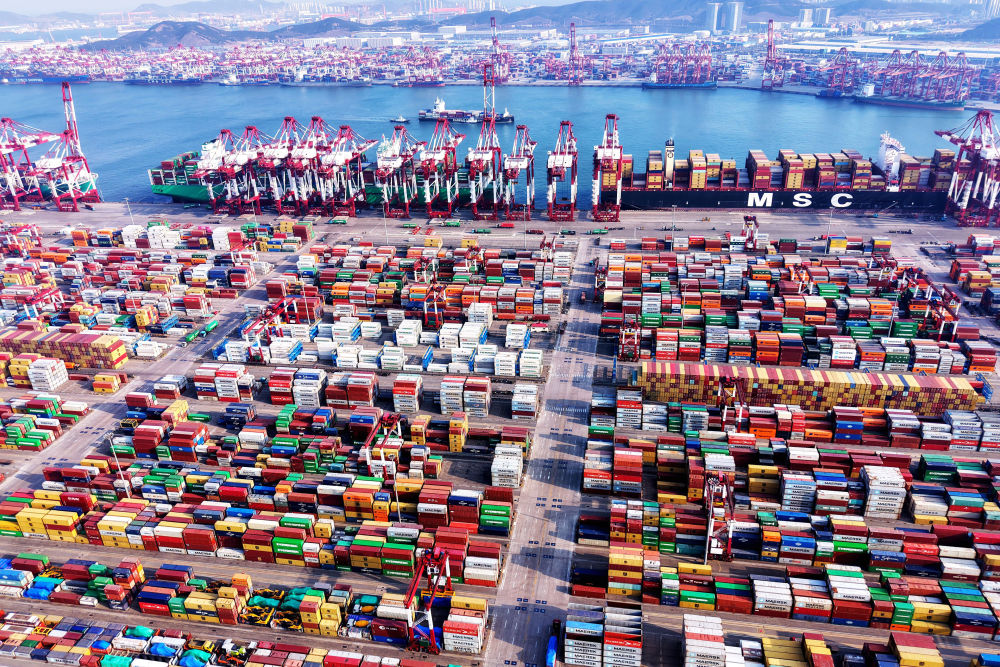 這是2月23日拍攝的山東港口青島港外貿(mào)集裝箱碼頭(無人機(jī)照片)。2025年以來,青島港開通2條到東南亞、地中海方向的“一帶一路”航線,合計(jì)新開4條國際集裝箱航線,加快世界一流海洋港口建設(shè)。新華社發(fā)(俞方平 攝)