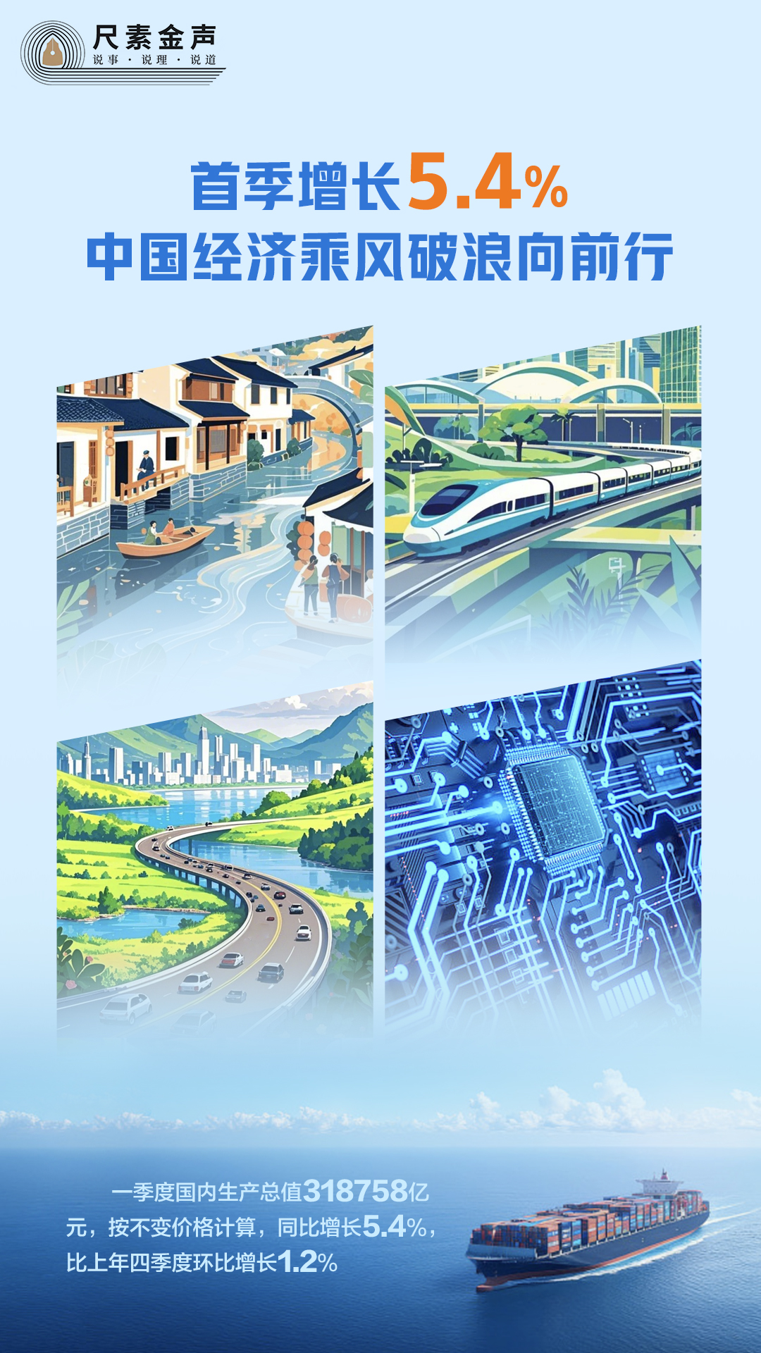 初步核算,一季度國內(nèi)生產(chǎn)總值318758億元,按不變價格計算,同比增長5.4%,比上年四季度環(huán)比增長1.2%。