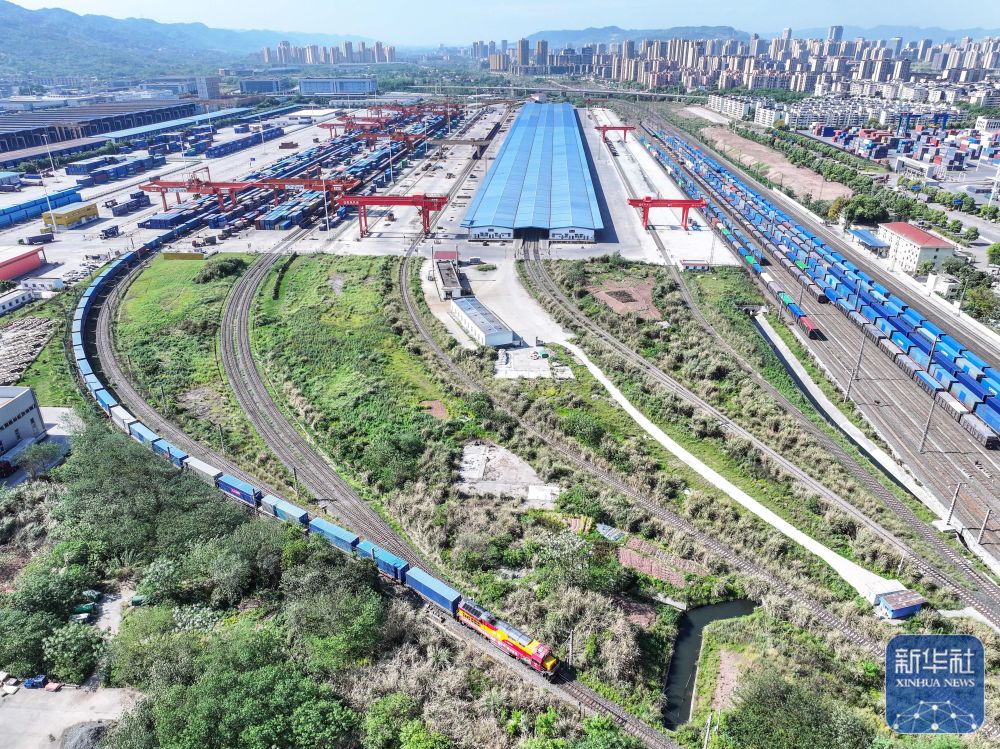 4月20日,圖定中亞班列在重慶團(tuán)結(jié)村中心站順利發(fā)車(無人機(jī)照片)。