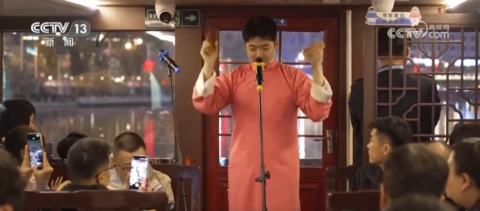 這段快板可不是在傳統(tǒng)的茶館里,而是在海河的游船上。這是最近在天津特別火的旅游項目,相聲主題游船特邀津門曲藝名家登船獻藝,將傳統(tǒng)相聲與海河風光巧妙融合,游客在欣賞兩岸美景的同時,又可以感受曲藝的魅力,可謂一舉兩得。游客說:“在游船上聽相聲是不一樣的體驗,上了游船,站在甲板上,看著兩邊的霓虹燈光,特別愜意?!?/p>