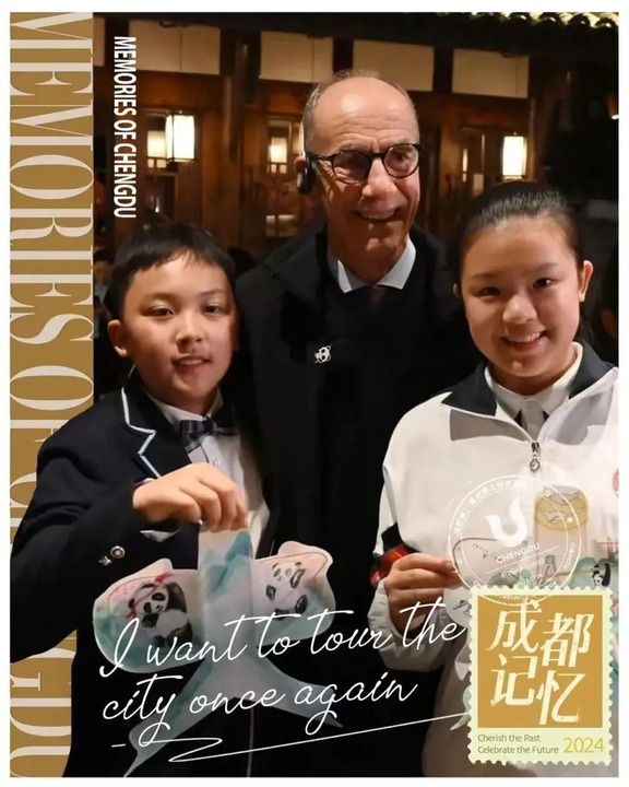 國(guó)際大體聯(lián)主席艾德收到的成都記憶定制文創(chuàng)風(fēng)箏。圖為他與成都中小學(xué)生的合影。新華社發(fā)
