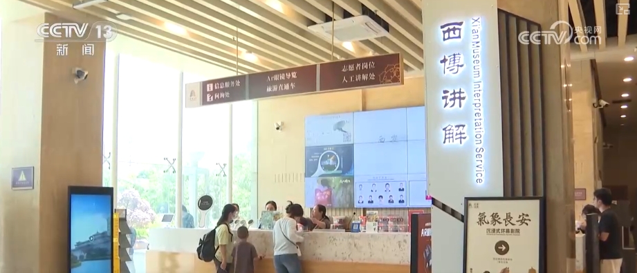 西安博物院公共服務(wù)部工作人員楊蕊伊介紹,“五一”期間,票務(wù)、安保、保潔人員增加了班次,同時也增設(shè)了大量的值班人員。在講解方面,講解人員、志愿者人員都增加了人數(shù),同時也增加了講解班次。他們在西門、北門都設(shè)有游客服務(wù)中心,為廣大游客提供便利服務(wù)。針對于國際游客,他們有英文版的自助導覽機提供服務(wù)。
