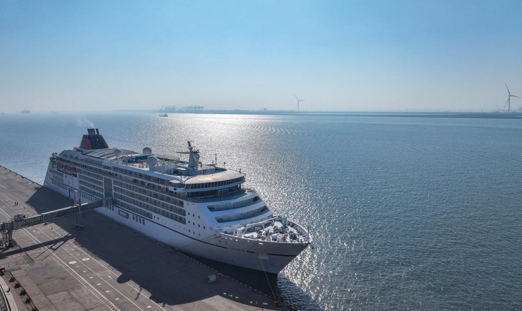 “歐羅巴2”號郵輪靠泊天津國際郵輪母港(無人機(jī)照片)。新華社記者孫凡越攝