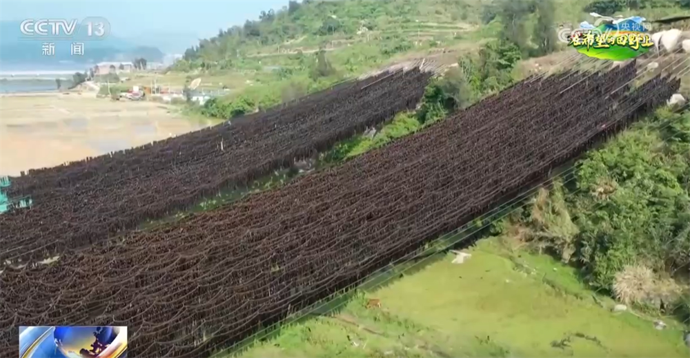 霞浦縣依山傍海,當(dāng)?shù)仞B(yǎng)殖戶巧妙利用地形的高低差,借助電動滑輪將海帶從山腳掛至半山腰晾曬。