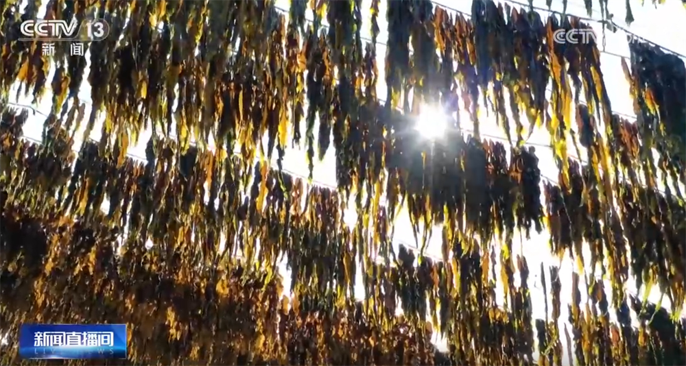 從空中俯瞰,成排鋼索從半山腰鋪架下來,層層疊疊的海帶如綠色瀑布傾瀉。與傳統(tǒng)地面晾曬相比,這種立體掛曬的方式通風(fēng)性更好,能縮短晾曬周期,還能減少泥沙附著,保持海帶潔凈干爽,提升海帶品相。