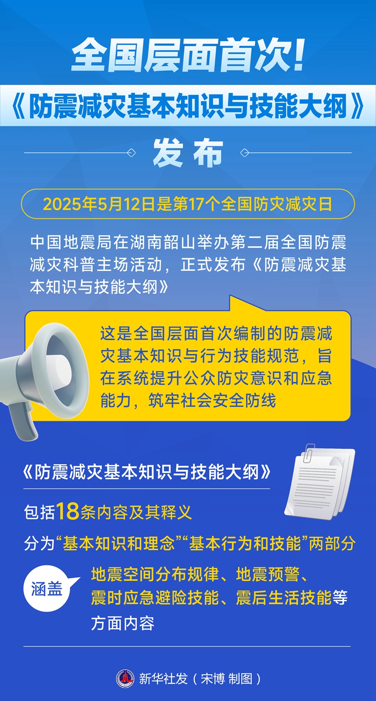 今年5月12日是第17個全國防災減災日。當天,中國地震局在湖南韶山舉辦第二屆全國防震減災科普主場活動,正式發(fā)布《防震減災基本知識與技能大綱》,這是全國層面首次編制的防震減災基本知識與行為技能規(guī)范,旨在系統(tǒng)提升公眾防災意識和應急能力,筑牢社會安全防線。