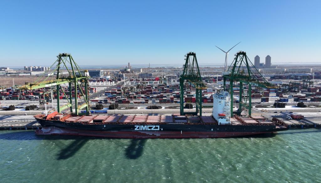 2023年12月21日,“羅安達輪”集裝箱船靠泊在天津港(無人機照片)。當日,“羅安達輪”集裝箱船正式從天津港出發(fā),駛向哥倫比亞、厄瓜多爾、秘魯、智利等南美洲國家,標志著天津港正式開通天津—南美西新航線。新華社記者 趙子碩 攝