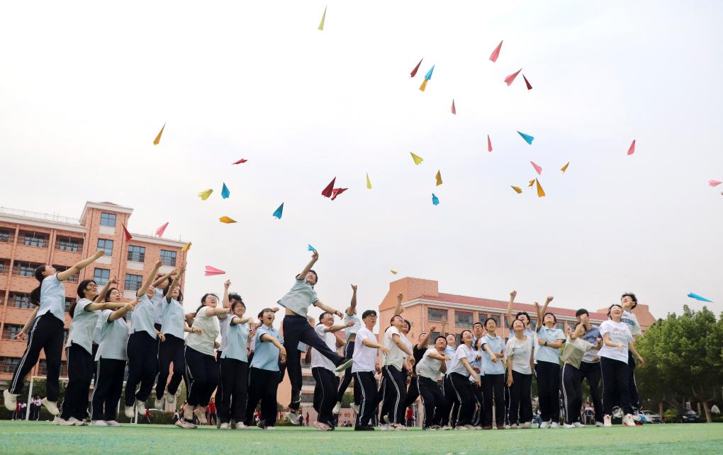 5月22日,在山東省高密市第五中學(xué),高三學(xué)生將寫有夢想的紙飛機(jī)拋向空中。高考臨近,各地學(xué)校組織高三學(xué)生開展不同形式的減壓活動,幫助學(xué)生放松心情,迎接高考。 新華社發(fā)(李海濤攝)