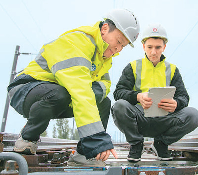 在塞爾維亞諾維薩德的匈塞鐵路塞爾維亞段項目部營地,中國員工段偉(左)與外籍員工一起檢查軌道施工情況。