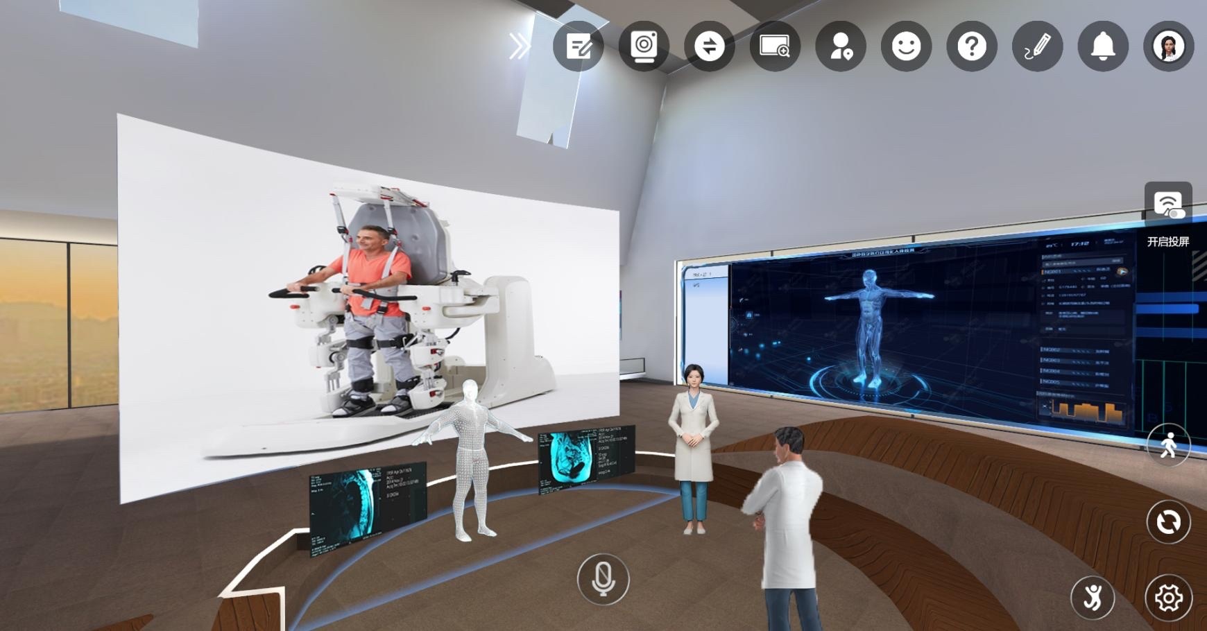 “就像推開一扇通往平行世界的門,這種‘在場感’是傳統(tǒng)遠程協(xié)作難以企及的?!本S賽客首席運營官徐晨翔邊演示邊解釋道。他調(diào)出了VS·work中的“智聯(lián)康復(fù)元診療平臺”——這是維賽客在醫(yī)療元宇宙領(lǐng)域的創(chuàng)新應(yīng)用,集成了病情診療、康復(fù)訓(xùn)練、社交培訓(xùn)等功能。在虛擬界面中,醫(yī)生可以通過高精度空間定位系統(tǒng)“走進”患者的虛擬診療室,患者則通過可穿戴設(shè)備完成肌力評估、平衡訓(xùn)練等動作,數(shù)據(jù)實時反饋至醫(yī)生終端,為偏遠地區(qū)的患者提供了更加便捷、高效的診療服務(wù)。