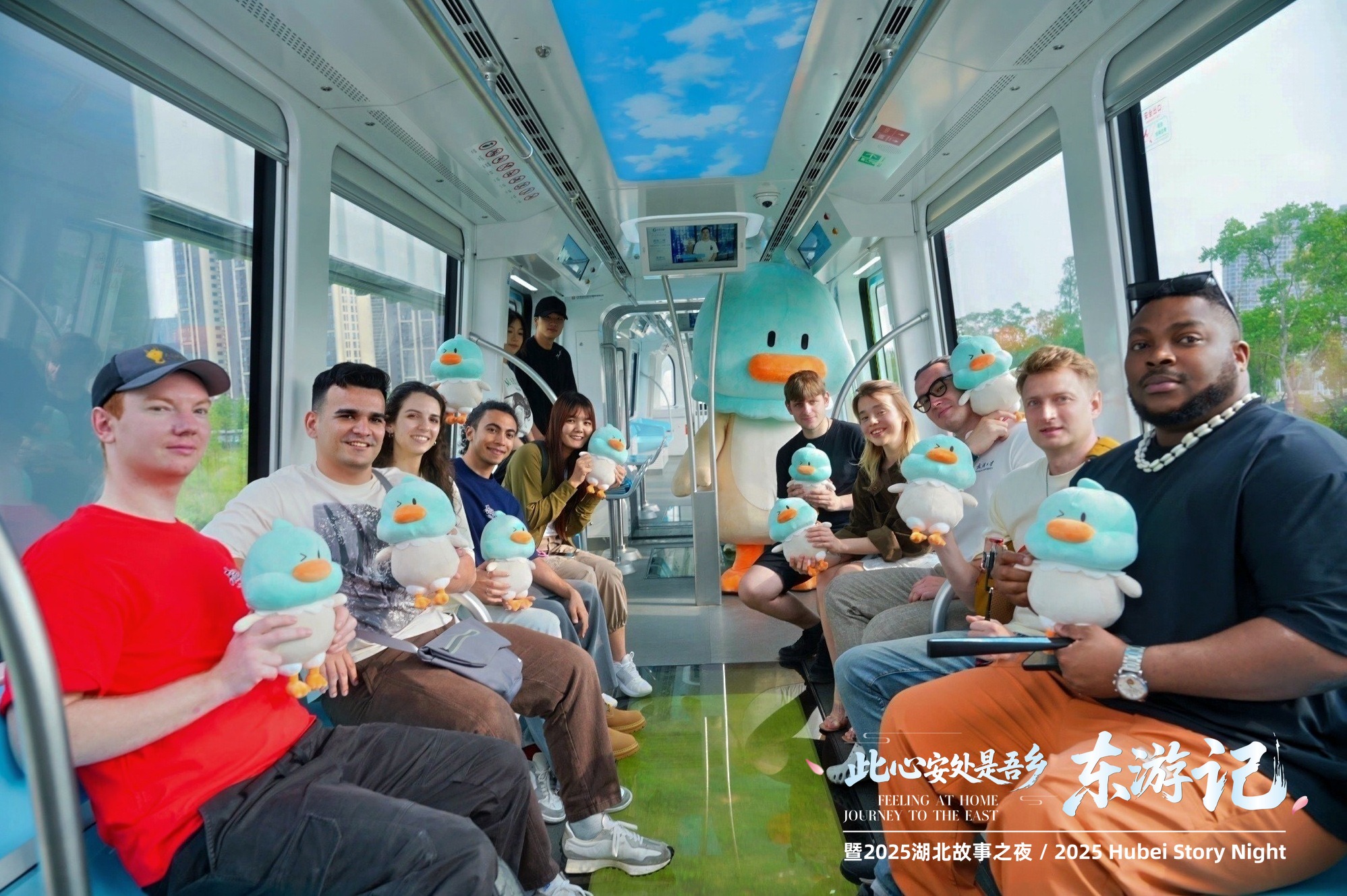 武漢新晉網(wǎng)紅打卡地怎么少得了光谷空軌,在吉祥物青青鴨的帶領(lǐng)下,體驗(yàn)官們踏上了空中交通之旅。270°全景視窗將城市天際線(xiàn)變成流動(dòng)畫(huà)卷,無(wú)人駕駛系統(tǒng)在空中穿行如科幻大片。這種新奇的乘車(chē)體驗(yàn)引得大家連連贊嘆,俄羅斯留學(xué)生可欣興奮的說(shuō),“我感覺(jué)自己飛起來(lái)了,像鳥(niǎo)一樣飄在空中?!?/p>