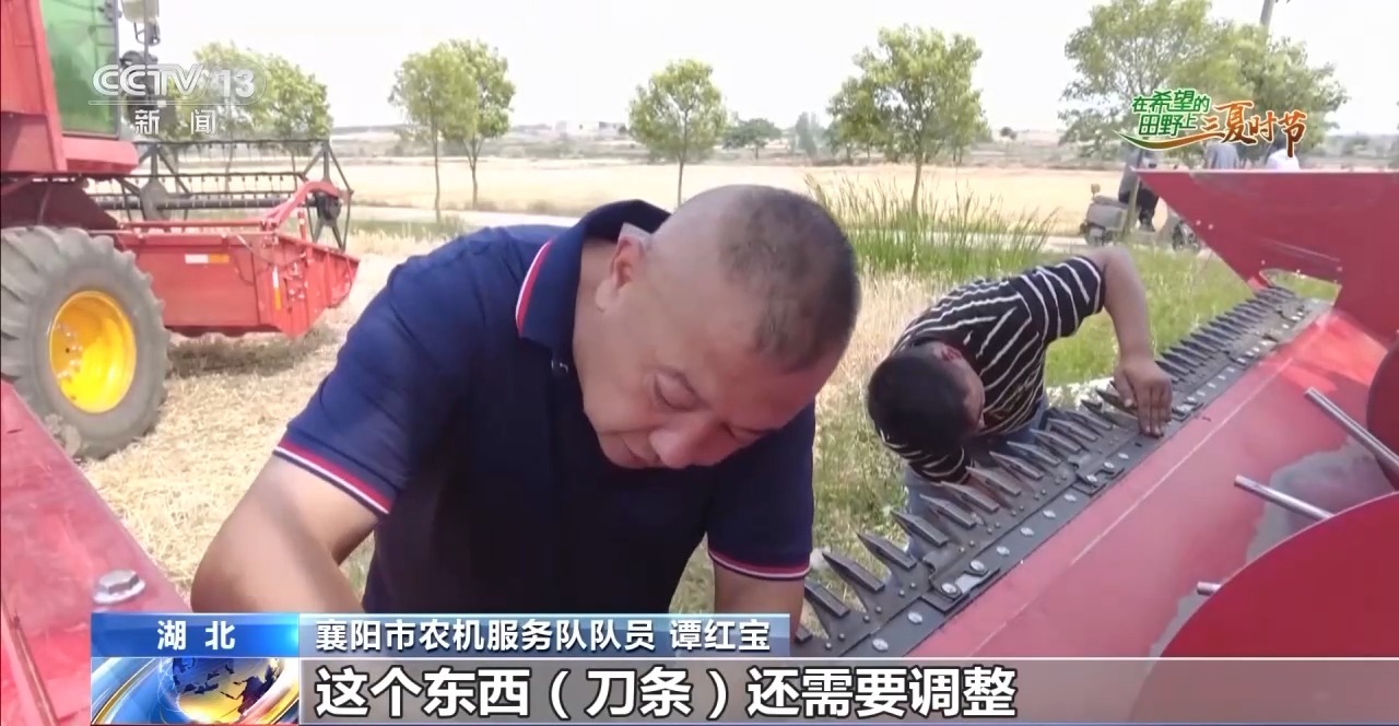 農機維修也是夏收中非常重要的一個環(huán)節(jié)。在湖北省襄陽市襄州區(qū)黃龍鎮(zhèn)潘明村的1000畝大田里,6臺收割機正趕在雨前搶收。突然,一臺收割機出現(xiàn)故障止步不前,機手撥打維修電話20分鐘后,農機服務車趕到了麥田旁。經(jīng)過檢修發(fā)現(xiàn),這臺收割機刀條發(fā)生了斷裂。