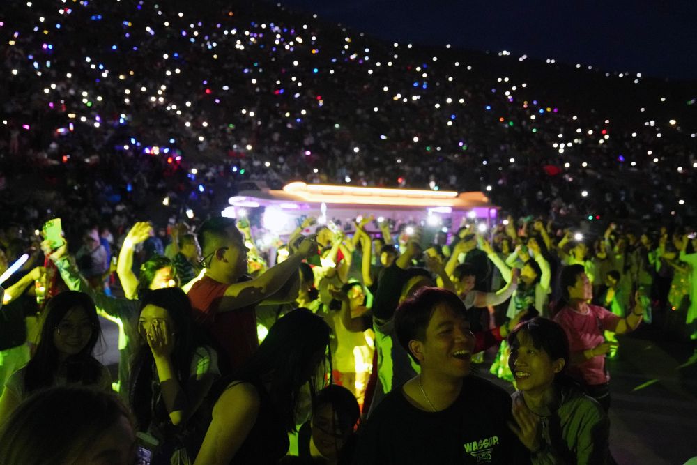 游客在敦煌鳴沙山月牙泉景區(qū)參加萬人星空演唱會。新華社記者 馬寧 攝