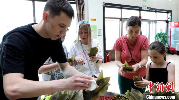 俄羅斯游客在雙鴨山市饒河縣學(xué)習(xí)包粽子?!○埡涌h融媒體中心供圖