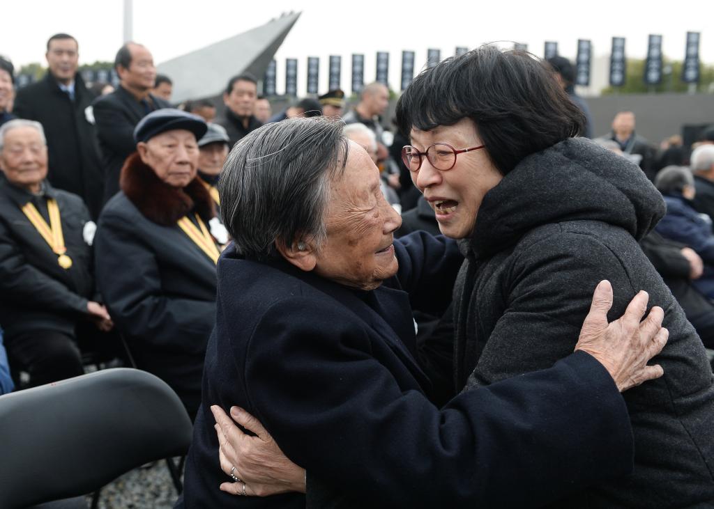↑2017年12月13日,南京大屠殺死難者國家公祭儀式開始前,夏淑琴與日本友人松岡環(huán)(右)擁抱交流。