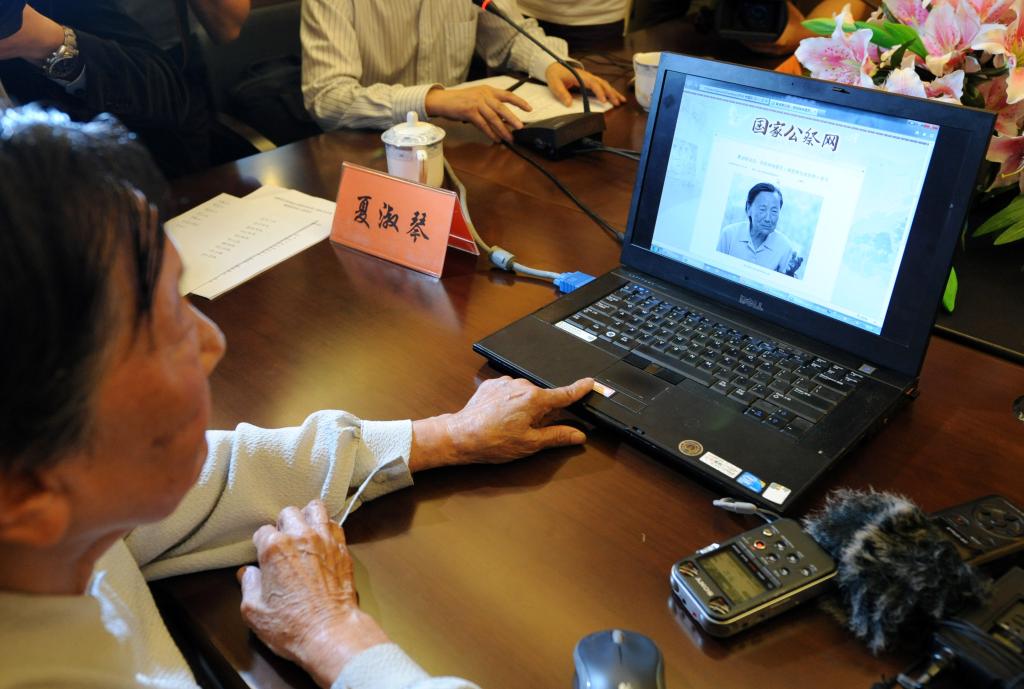 ↑2014年9月17日,夏淑琴點開自己口述證言公布網(wǎng)頁。從當日起,侵華日軍南京大屠殺遇難同胞紀念館連續(xù)100天每天在國家公祭網(wǎng)和紀念館官方網(wǎng)站上公布一位南京大屠殺幸存者口述證言。新華社記者 孫參 攝