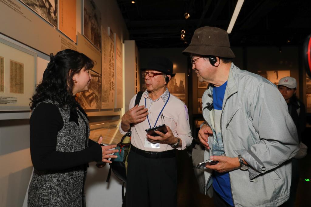 ↑2025年3月26日,夏淑琴的外孫女夏媛(左一)在侵華日軍南京大屠殺遇難同胞紀念館給日本“紫金草合唱團”成員講解。新華社發(fā)