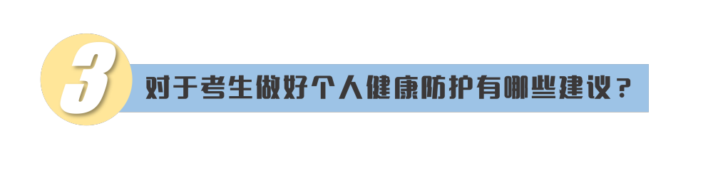 考生要做好個人防護,當(dāng)好自身健康第一責(zé)任人??记氨M量減少聚集和流動,不去人員密集場所。同時,調(diào)整好心理狀態(tài),保證合理的飲食、充足的睡眠、適當(dāng)?shù)纳眢w鍛煉,如有不適,要及時就醫(yī)治療,謹防因身體不適而影響考試。對于發(fā)熱或者突發(fā)急病等考生,也不必擔(dān)心恐慌,各地考點都制定了相應(yīng)的預(yù)案。