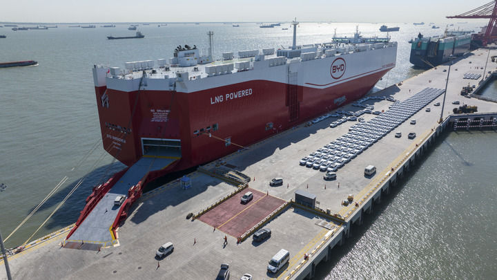 2025年4月26日,出口汽車在蘇州港太倉港區(qū)碼頭集中裝載上“深圳號”汽車運(yùn)輸船(無人機(jī)照片)。新華社發(fā)(王須中 攝)