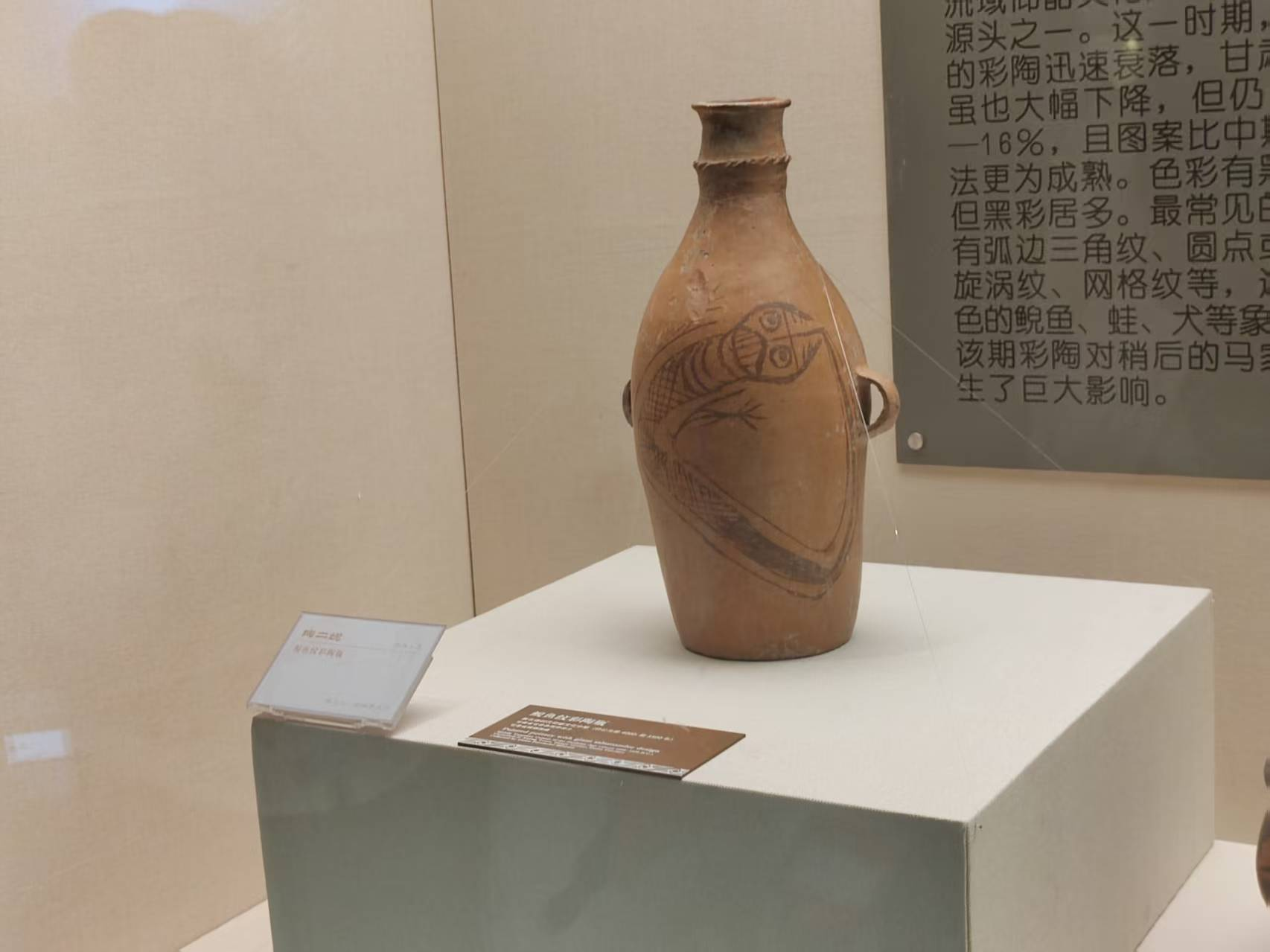 在“彩陶之鄉(xiāng)”主題展區(qū),仰韶文化鯢魚紋彩陶瓶成為焦點(diǎn)。這件距今5500年的陶瓶,腹部繪有人面鯢魚紋,被認(rèn)為是早期“龍圖騰”的雛形?!八赡苁欠诵蜗蟮某橄蟊磉_(dá),印證了甘肅作為中華文明重要發(fā)源地之一?!敝v解員介紹。作為甘肅唯一一件彩陶類國(guó)寶,其神秘圖案引發(fā)了采訪團(tuán)對(duì)史前先民精神世界的無限遐想。