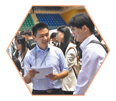 中國人民大學(xué)經(jīng)管專場(chǎng)雙選會(huì)現(xiàn)場(chǎng),合作企業(yè)工作人員(左)與求職同學(xué)交流。 中國人民大學(xué)供圖