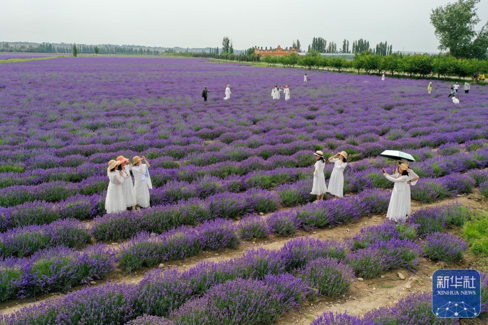 游客在新疆伊犁哈薩克自治州霍城縣解憂公主薰衣草農場游玩(6月14日攝,無人機照片)。
