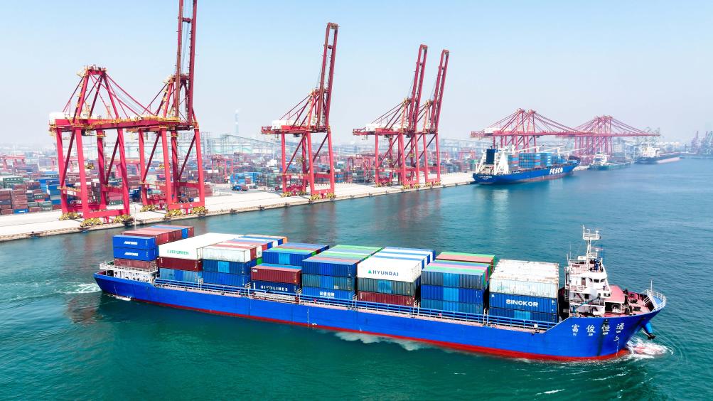 5月20日,在山東港口日照港集裝箱碼頭,滿載集裝箱的船舶駛離港口。新華社記者 郭緒雷 攝