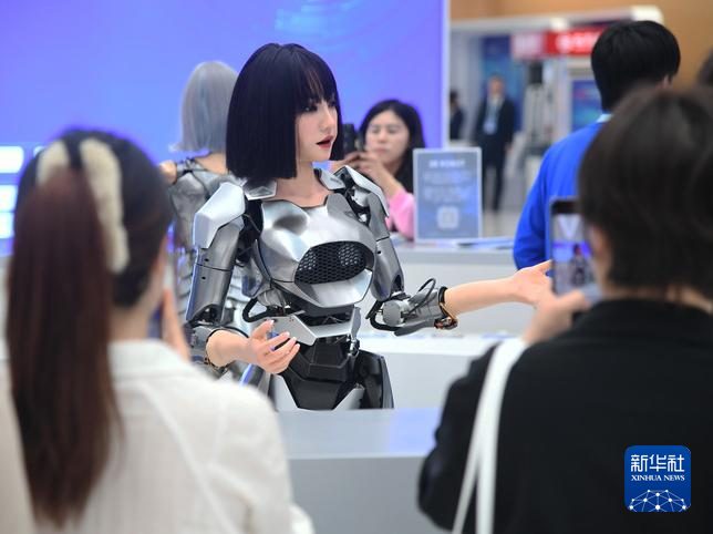 仿生人形機器人在2024中關(guān)村論壇年會會場設(shè)置的咨詢臺“迎賓”(2024年4月27日攝)。新華社記者 任超 攝