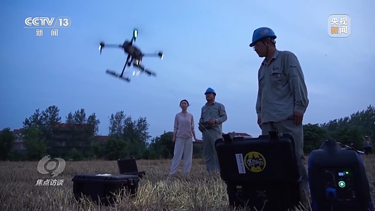 像放風(fēng)箏一樣,一個(gè)人從供電機(jī)牽線,另一個(gè)人控制無人機(jī)飛行,兩人打好配合,燈隨著車走。經(jīng)過五次磨合試飛,600瓦的燈光終于刺破夜空,照亮了兩畝麥田的區(qū)域。供電所技術(shù)人員的駐守,讓吳從先家的小麥在暴雨來臨前全部入倉。